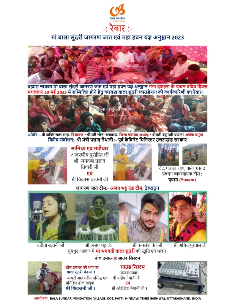 आदरणीय भक्तों, हर वर्ष की भांति इस वर्ष भी मां भगवती बाला सुंदरी जागरण जागरण जात एवं महा हवन यज्ञ अनुष्ठान गंगा दशहरा के पावन पवित्र दिवस रविवार 30 मई 2023 पर होना सुनिश्चित हुआ है। सभी बाला सुंदरी भक्तों से करबद्ध निवेदन है कि इस पवित्र अनुष्ठान में सम्मिलित होकर पुण्य के भागीदार बनेंगे।